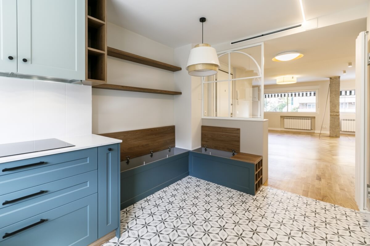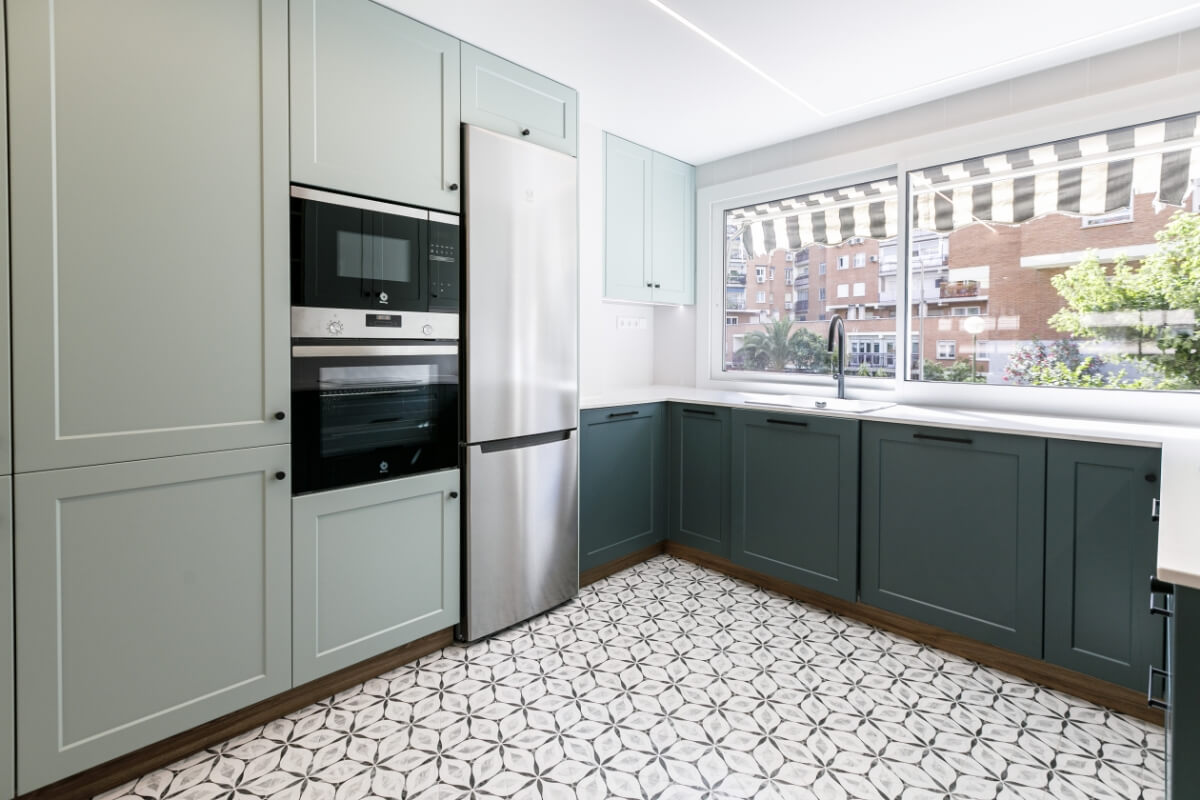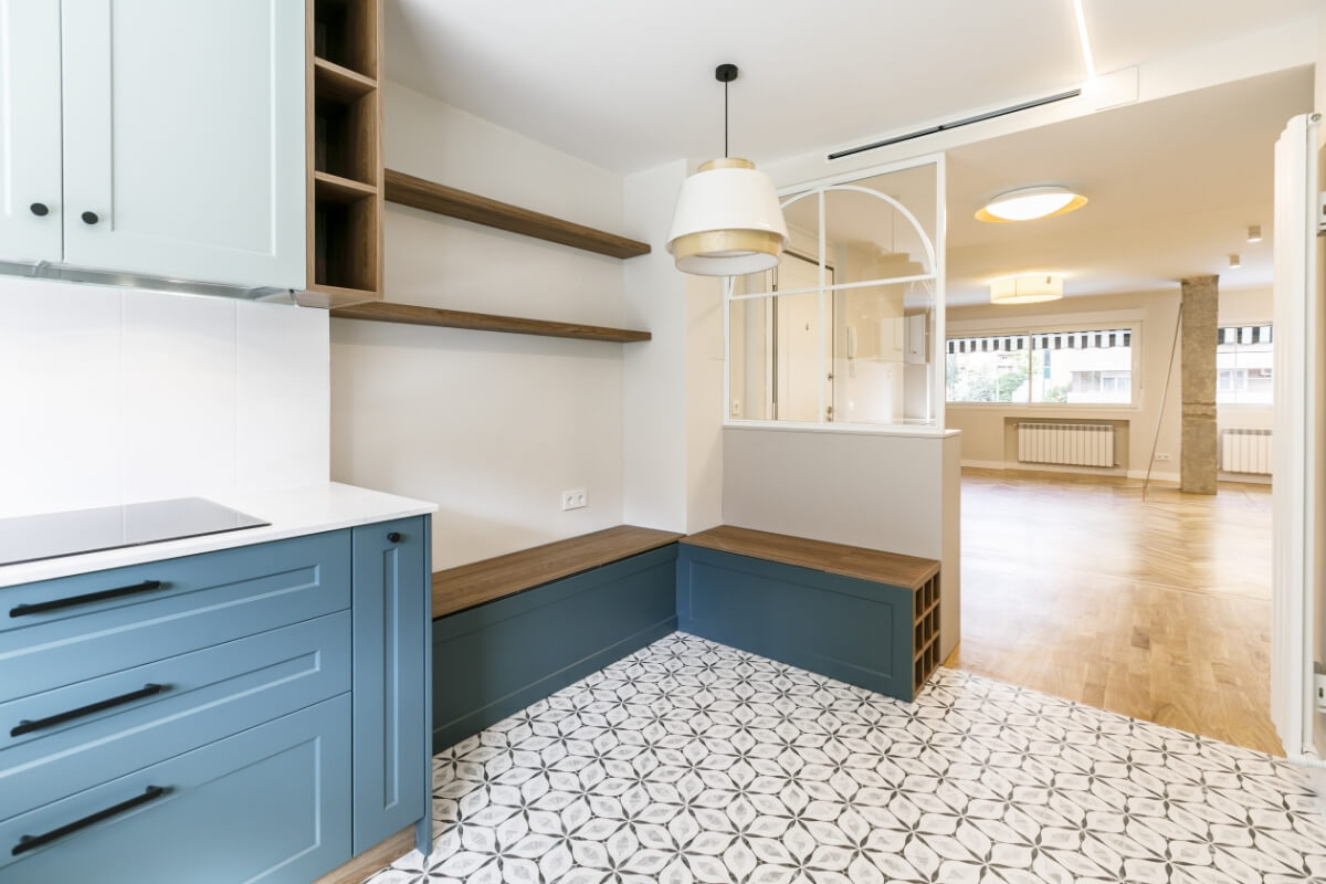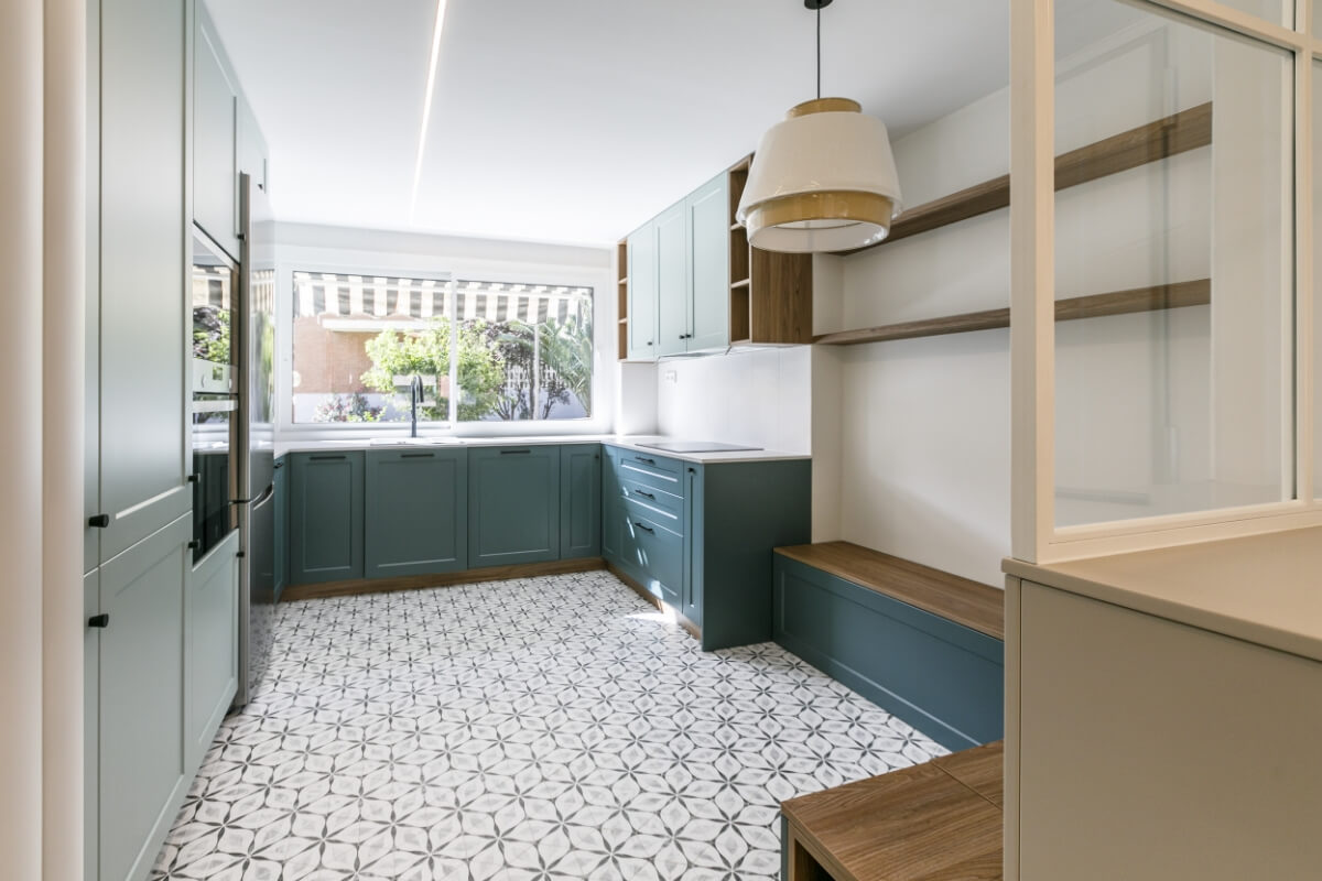 La cocina tiene mobiliario blanco mate con madera y azules, la encimera imitación piedra con alicatado solo entre muebles.