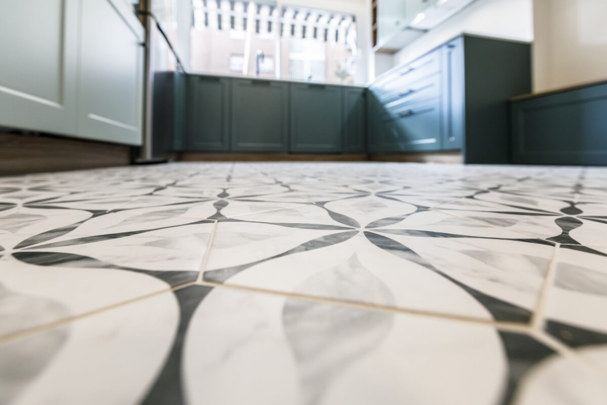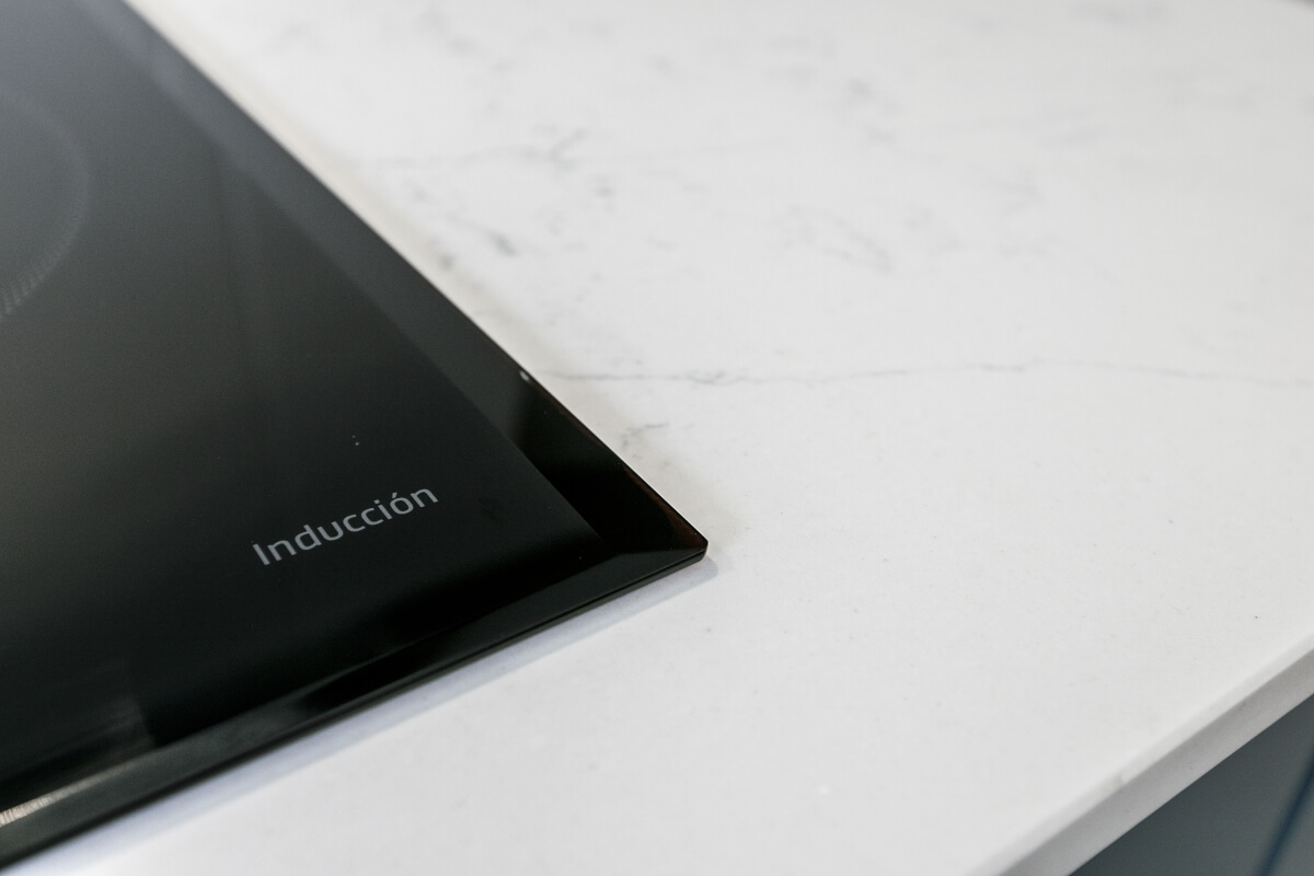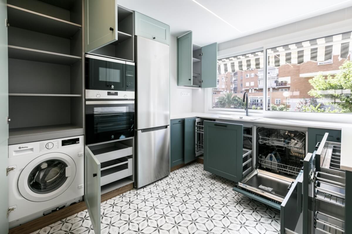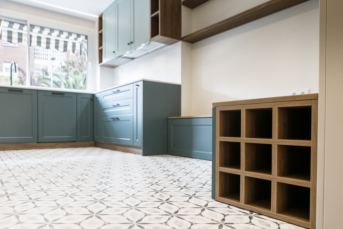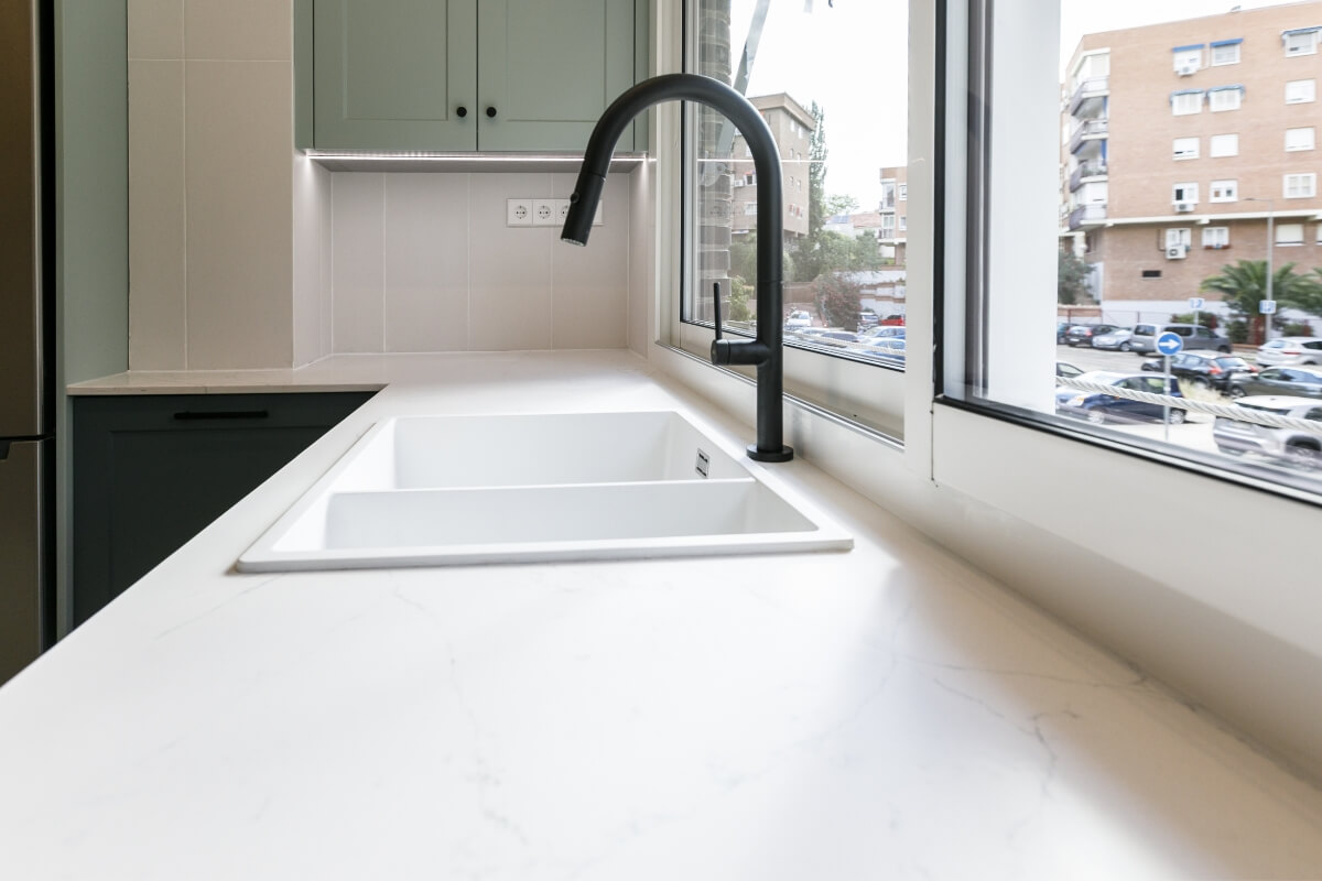 La cocina tiene mobiliario blanco mate con madera y azules, la encimera imitación piedra con alicatado solo entre muebles.